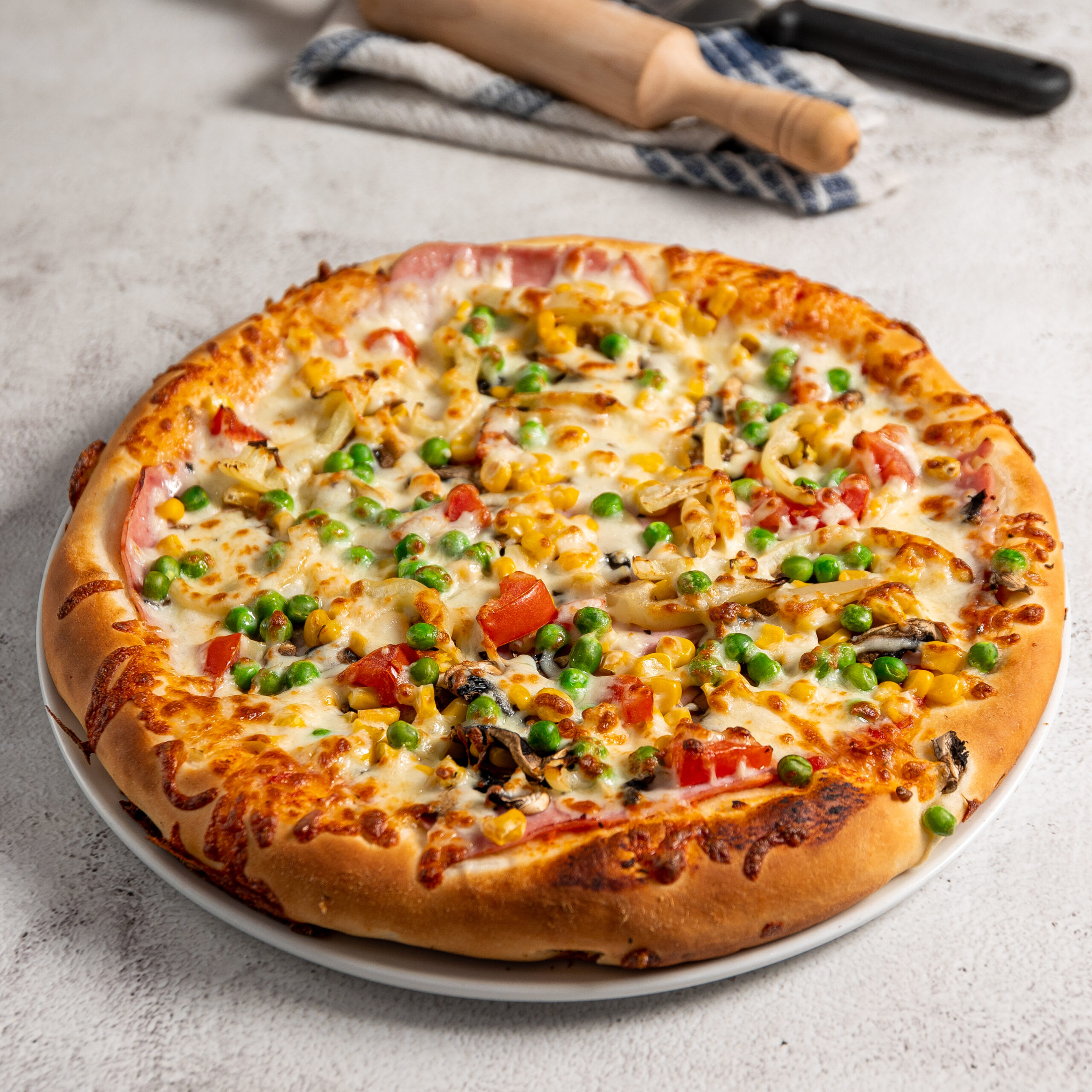 Feltétek: Gomba, Kukorica, Mozzarella, Olivabogyó, Paprika, Paradicsom, Sonka, Zöldborsó3650 Ft