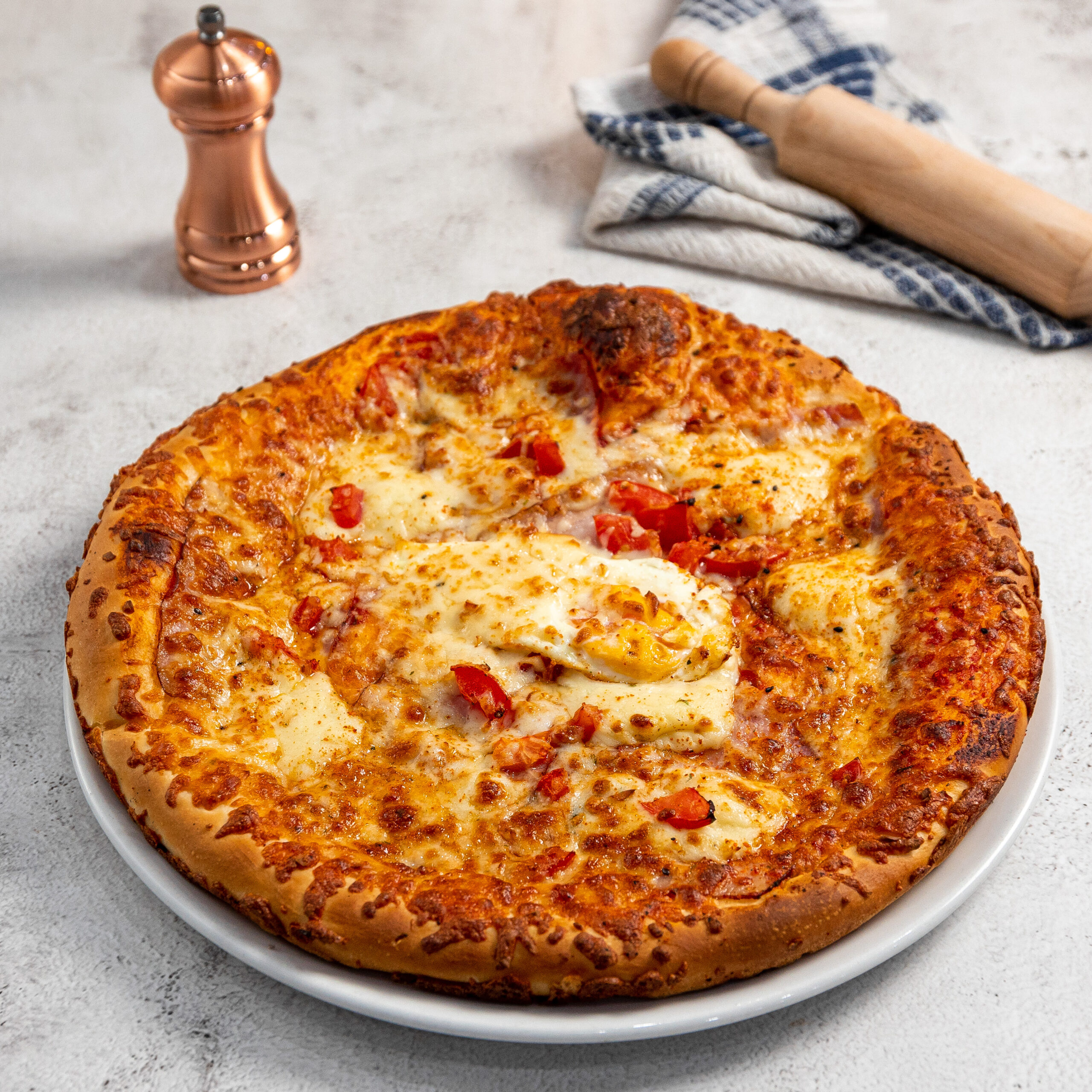 Feltétek: Bacon, Besamel, Chilli, Füstölt sajt, Mozzarella, Paradicsom, tojás3500 Ft