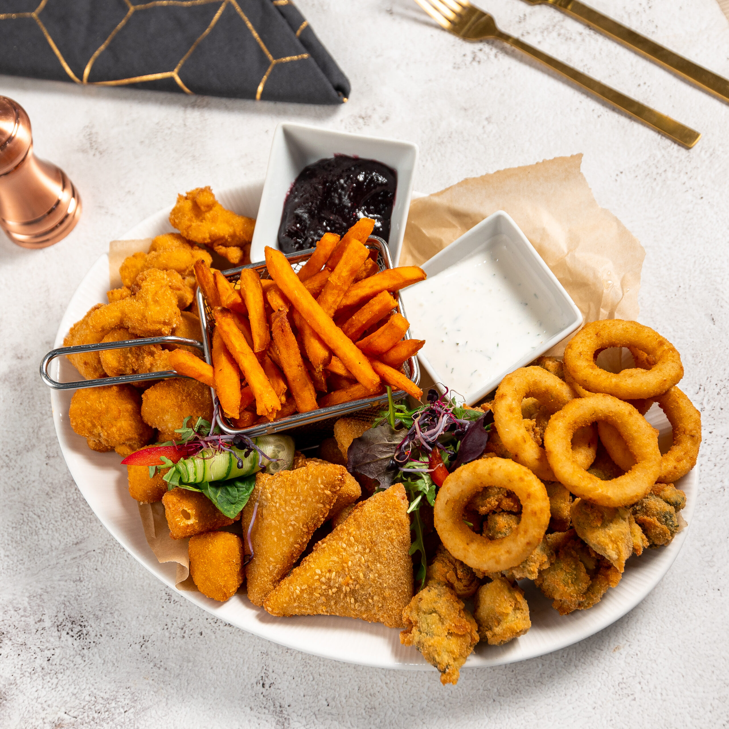 Fűszeres csirkeszárny, szezámos csirkemell, rántott karfiol, rántott camambert, rántott gomba, Jalapeno paprikával és cheddar sajttal töltött nuggets steak burgonyával és öntetekkel.